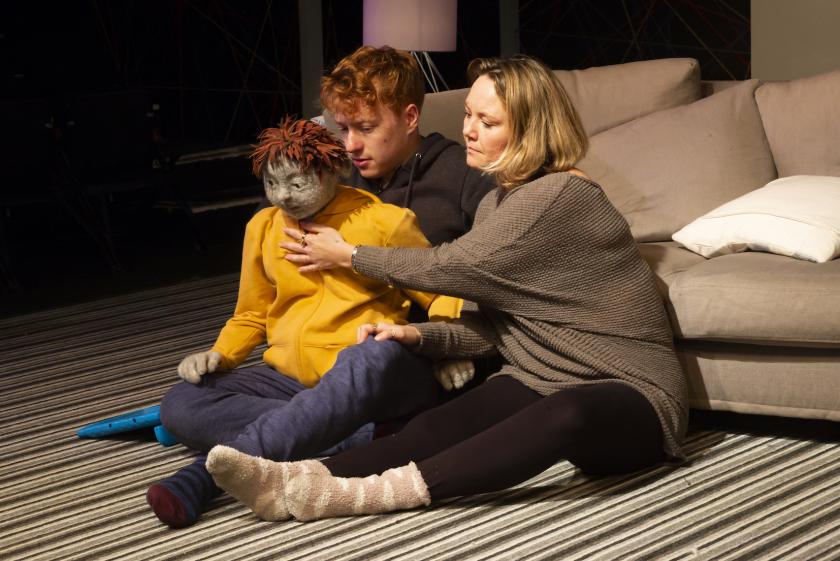 The decision to have the boy, Laurence, played by a grey-faced puppet, has caused considerable controversy. Autistic campaigners and their allies have organised a petition, galvanised the media and Twitter and on press night staged a well-mannered protest outside the theatre. In their opinion, the puppet in All in a Row is another example of dehumanising autistic people. Certainly it is a baffling choice by designer/director Sîan Kidd as the puppeteer Hugh Purves’s face is visible at all times and he not only makes sounds but also facial expressions. The puppet is a redundant, clumsy distraction, an awkward torso with limbs and a felt head attached to Purves’s body. The decision not to cast a child actor, autistic or otherwise, is reasonable; it’s hard to imagine any 11-year-old performer enduring the physical and emotional abuse that’s meted out on stage. But there’s no reason not to cast an adult in the role; effectively that is what’s happened by making Purves an obvious presence.