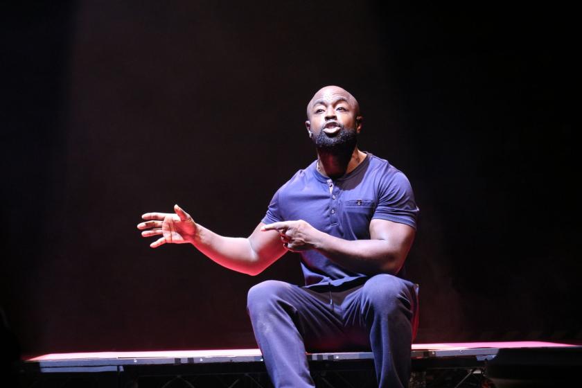 Michael Balogun as Delroy in 'Death of England'A formidable ask of a lone actor here required to take immediate charge of the cruciform playing space of a reconfigured Olivier, Death of England: Delroy introduces an instant star in the hitherto little-known Michael Balogun, who has stepped in triumph into shoes vacated by Olivier winner Giles Terera (Hamilton) following Terera's departure from the project due to illness. The National's largest auditorium has reduced its capacity to 470, with the audience seated (socially distanced, 'natch) on all sides. If that signals much that is different about London's flagship theatre just now, I'm happy to report one theatrical mainstay still in place: I doubt I was alone in my delight at encountering actual physical programmes once again, lest one of the legacies of the virus might be to put paid to such physical mementos for keeps.