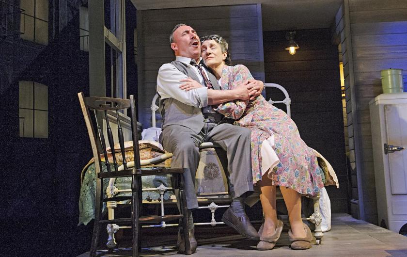 Anthony Sher as Willy Loman (left) and Alex Hassell as Biff in Death of a SalesmanThough not quite its lynchpin, Linda is the play’s emotionally still centre. And it’s a role that Walter, with her deliciously broad Brooklyn accent, seems to make so much larger than it appears on the page. There’s a depth she brings to a part that gives Linda almost no interior life. When Walter manages to pull off the line, “Attention, attention, must be finally paid to such a person” – hardly the easiest to speak – there’s a rawness in her commanding delivery. This time Sher matches her in the highly charged, high-emotions stakes. Towards the end, there are plenty of sniffles as Willy and Biff engage in a kind of desperate fight/hug/collapse (pictured above, in an earlier scene).