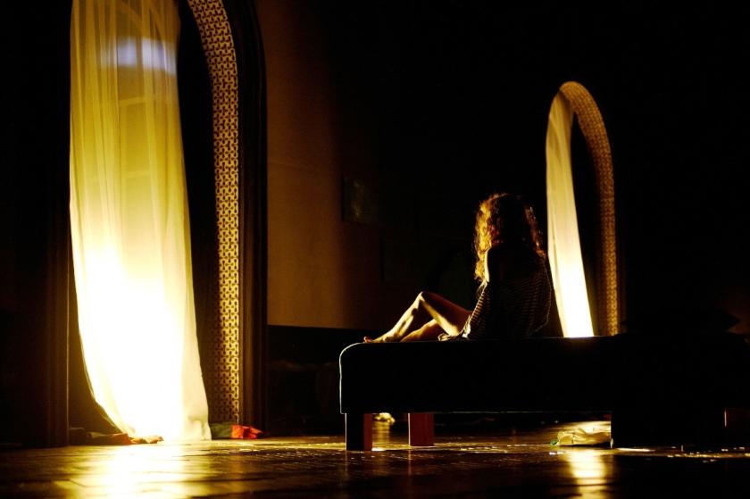 The single set, a multi-functional art-deco-ish room in underwater blue with fluid mirrors and lighting (set by Magdalena Maciejewska, lighting by Jacqueline Sobiszewski), indicates the updated nature of the story, as do the opening lines, an only intermittently comprehensible account of neutrons and particles and abstractions like ‘The past is trapped in eternity’.