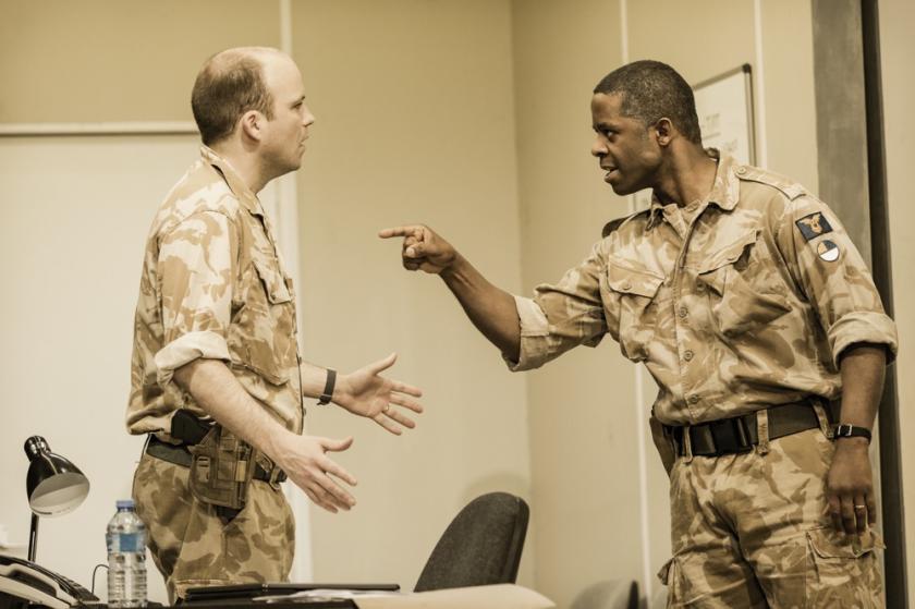 But as the steady drip-drip of Iago’s poison begins to act, the violence that is part of the weaponry of a general who has been a soldier since childhood, and that he puts to focused and controlled use in combat, possesses him in his private torment. Lester charges over furniture to pin Kinnear against a wall by the throat on hearing his first toxic hints. His interrogation of Olivia Vinall’s pale, delicate, mothlike Desdemona about the loss of the fateful handkerchief resembles a kind of tender torture that leaves her trembling in terror and confusion. If Vinall has a fragile femininity, Lyndsey Marshal as Iago’s wife Emilia, diminutive yet tough in her fatigues, is a woman working hard to be one of the boys. As the tragic conclusion looms, she and Vinall share an intimate exchange, over cans of lager, in which Emilia’s jokes about the ill-treatment of women by men grow so savagely bitter that Desdemona recoils in shock. It’s not difficult to imagine this Emilia taking a beating from her husband – and refusing ever to tell a soul. And the eavesdropping arranged by Iago to prove Desdemona’s adultery, with Jonathan Bailey’s young, likable, open-faced Cassio, sees Othello vomiting and hiding, degradingly, in a toilet cubicle, before collapsing on the floor in a fit while Kinnear stands over him, watching and calmly sipping from a glass of water.