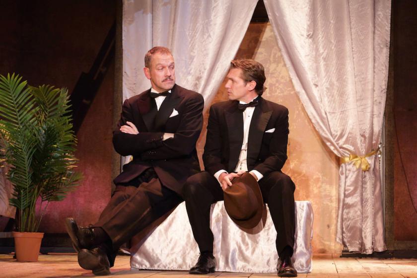 David Rogers has based his play pretty faithfully on that script. When talented but naïve grifter Johnny Hooker (Ross Forder) mistakenly cons vicious mobster Doyle Lonnegan (John Chancer), his partner is murdered and he is forced to go on the run. Seeking revenge, Hooker seeks out the help of the consummate conman, Henry Gondorff (Bob Cryer), who agrees to devise a “big con” with Lonnegan as the mark.
