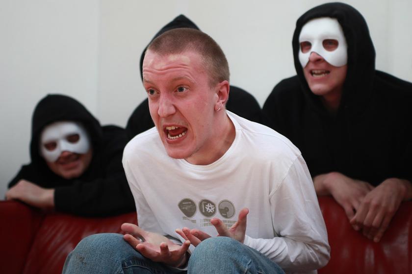 The In Your Face Theatre Company’s production immediately breaks down any barriers between performers and audience, and – be warned – you’re as likely to get a face full of spit, or be pushed out of your seat, as get beshitted bedclothes rubbed in your hair. This gives the evening an energetic vitality, and the young cast is fully committed to the show. At the same time, my excitement at seeing some of these familiar scenes restaged could not blind me to the messy and uneven quality of directors Greg Esplin and Adam Spreadbury-Maher’s immersive experience that, at its best, sees them coursing through the audience like smack from a hit.