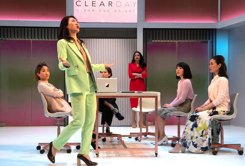 American director Nana Dakin's production is entertainingly shiny, with a well-lit office set designed by Moi Tran and Ian William Galloway's projections of internet comments and rapidly escalating YouTube views livening up the action. The ensemble cast is confidently led by Farzana Dua Elahe (Priya) and Minhee Yeo (Soo-Jin), with vivid contributions from Kae Alexander (Built) and Harry Potter and Chimerica star Katie Leung (Sunny), and solid work from Momo Yeung (Xiao) and Kanako Nakano (Ruki). Televison and film actor Arty Froushan makes an excellent stage debut as Marcel. But despite the attractive sheen of this office sitcom, and the glancing insights that occur along the way, the play can't quite shake off its superficial feel. As Sunny says, "ai-ya!"