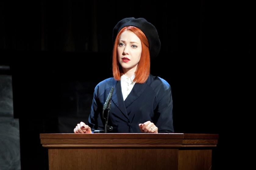 Lucy Bailey’s site-specific production is a delight. The octagonal Council Chamber (pictured above), originally designed by architect Ralph Knott in the 1920s, was once the debating chamber of the Greater London Council, and its vast marble columns and pompous monumentality fits well with the formality of the court proceedings. The audience sits in the councilors' seats, complete with carved wood, leather and little tables. The smell is olde worlde, and the imposing historic atmosphere adds to the story. There are some superfluous sound effects piped to seats through the speaker systems, but Bailey’s direction is efficient and effective.