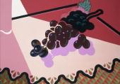 And there is many a twist and turn to come. From the 1970s on, Caulfield, often using postcards and photographs as sources, inserts with superb technique visual aperçus: realistically painted landscape, as in the Castle of Chinon in After Lunch, 1975, as though a view from the restaurant window; roses galore luxuriantly blooming in a variety of paintings; wallpaper patterns including William Morris, in Green Drink, 1984, which even includes a piece of rolled-up newspaper, partly outlined, partly realistic (another shade of cubism). And there is a riot of realistic food, from paella to mussels in Still Life: Maroochydore, 1980-1, with a semi-realistic river and village view through a window, and a china plate hung on the faux wood of the restaurant wall.