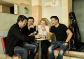The images are theme and variations: flatly painted blocks of bold colour – oranges, reds, purples, lilacs – outlined in black, depict still life, interiors of cafés, bars, restaurants, offices, apartments, patios, courtyards. They suggest the absent presence, as almost all are empty of people, with a handful of exceptions. Happy Hour, 1996, is a brilliant range of reds, punctuated by blues and lilac, that somehow convincingly show us the interior of a bar; but centrally placed there is an exquisitely realistic reflection in a wine glass of a waiter – or a drinker, delicately suggestive. There are windows that look out at nothing, and brilliantly lit lamps that shed no light on anything. The emptiness, the loneliness, can be intense, almost uncomfortably so. These are not paintings for the faint-hearted; this is a heartbreaking show.