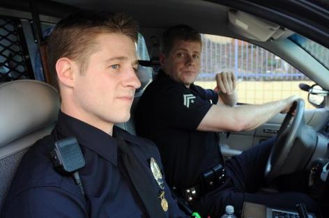 Det_AdamsFor its basic setup, the episode assumed the position familiar from movies like Training Day, putting us in an LAPD patrol car with rookie cop Officer Ben Sherman (Benjamin McKenzie) as he’s given a crash course in gangland etiquette, survival and street smarts from veteran Officer John Cooper (Michael Cudlitz). Cooper plays the unshockable old pro card a little too readily, with his homilies about how he can judge the threat level of a situation by whether or not the hairs on his arms stand on end, and the way that a “real” cop mystically knows that police work is his one true destiny.