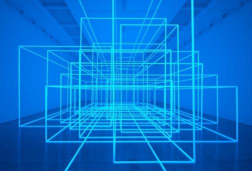 Since then, Babel, his collaboration with choreographer Sidi Larbi Cherkaoui, has been on view at Sadler’s Wells, but Test Sites is his first return to a gallery space. Babel was a useful preview to the main piece in the basement of White Cube: Breathing Room III, like the set for Babel, is a series of outlines of boxes. On stage, these boxes surrounded the dancers, who created dance-spaces with them, from basic squares to an elaborate ziggurat. Here the huge piece, in luminescent white paint, glows out of the basement darkness, an elaborate, complex series of interlocking shapes that measure out nothingness. Intermittently, the lights blaze out. For what purpose it is not quite clear – if it is simply a dissociative device, it perhaps works too well, as the viewers’ eyes quickly squint shut against the glare, and the white frames vanish against the white lights and white walls. But in the gloom, the piece has a stateliness, a sense of internal logic.