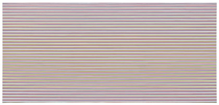 Riley has used an array of geometrical forms in her pursuit of vibrating movement. But the stripes – horizontal, vertical, diagonal – have been consistent throughout her long career (she’s a surprisingly youthful and energetic 83). This exhibition consists of 15 stripe paintings, as well as studies on paper, beginning, though it’s by no means a chronological hang, with the 1961 Horizontal Vibration (pictured below). This was painted in the year Riley abandoned figuration altogether, producing a number of black and white Op-art paintings, including the better-known Movement in Squares, whose black and white checks are painted as if the canvas is curving and dipping at the vertical point of the golden section.