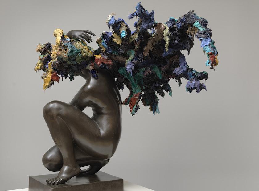 In sculptures such as Let Me Ferry You Out to Sea... 2017 (main picture), Brown achieves the opposite effect. The sterile perfection of a 19th century bronze sculpture is disrupted by a flurry of brushmarks that seem to have fallen off a painting and solidified into a chaotic morass of colour. Balanced on the head and shoulder of the naked nymph, this incongruous burden offers to warm the chilly bronze with wanton pulsations of unruly life.