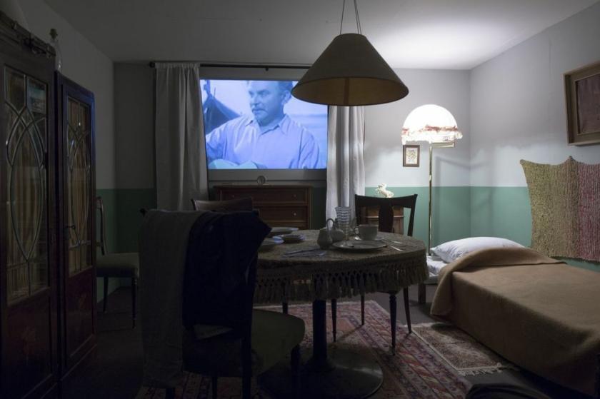 You don’t have to sit in the cinema; you can visit an all-purpose living room that has also been installed, where you'll find an aperture through which you can watch the films. The shabby timeworn room is exactly how a Westerner might imagine a communal room in a Russian city apartment: multifunctional, dreary, yet curiously dignified in its pathos. I can testify to its authenticity having toured several timewarp installations still preserved in Moscow and St Petersburg. The room has a small dining table, a couch, some worn-out wooden cabinets. A single bed indicates the cycles of the day, and the pictures on the wall and the films visible through the window indicate some kind of optimism – hope, desire, however misplaced or unrealistic.