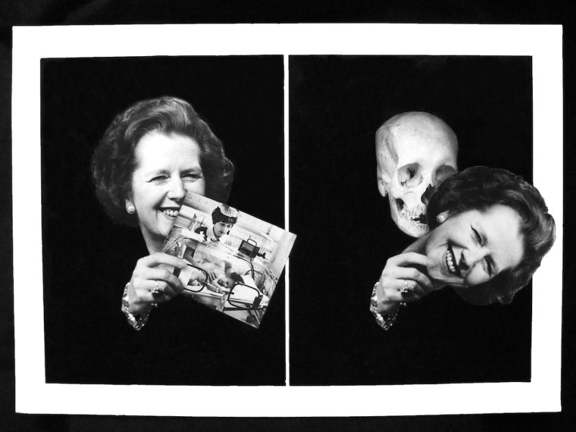 There’s a smiling Margaret Thatcher (main picture) holding up a photo of a nurse working in intensive care. But Maggie as a caring philanthropist is juxtaposed with another picture revealing her charming smile to be a mask hiding a skull. Kennard’s Maggie is an angel of death, not a saviour of lives.