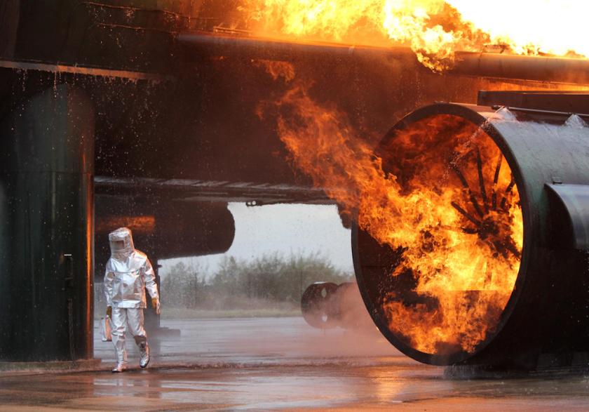 Simon Faithfull’s film EZY1899: Reenactment for a Future Scenario, 2012 (main picture), shows a fire breaking out in an aircraft engine and quickly engulfing the fuselage and wing. This is no ordinary plane, though, but a dummy used to test fire extinguishers. The footage may be dramatic, but no-one is in danger – not even the man wandering about in a fire hazard suit monitoring results.