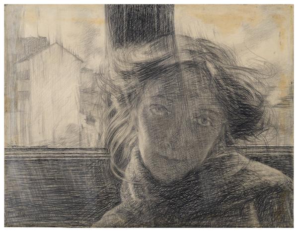 To think of these pieces merely as rejects is unrepresentative — but they do challenge preconceptions around what is valued in artists’ oeuvres. A striking, almost sentimental sketch of a woman against a window by Umberto Boccioni (Controluce, 1910) (pictured top) bears very little resemblance to the Futurist paintings for which he is known; nevertheless her expression is captured with idiosyncratic chiaroscuro and close attention to the informal incline of her head and snug fold of her scarf. The impression is of comfort and distance — her position is restful but her eyes are inscrutable. It is paired on the opposite wall with another portrait, Untitled, 1974 by Jannis Kounellis, possibly of a woman, scored into a mat of tempura, charcoal and glue. Again, the expression is intriguing, poised between melancholy and hope; again it is a step away from what is considered to be his main work.