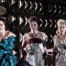 Annabel Arden’s staging revels in the physical constraints, the plotting and characterisation much clearer as a result. Alastair Miles’s Timur is a shabby, cowed wretch, his blindness implied with a mere smidgeon of face paint. Sunyoung Seo’s downcast, plainly dressed Liù stands out among the supporting cast, able to reduce her voice to a whisper while losing none of its colour. Rafael Rojas as Calaf is an impetuous, headstrong joy, his high register unchallenged by Puccini's louder tuttis. Set and costume designer Joanna Parker’s sole prop is a giant wobbly throne which begins to teeter precariously. Underneath which we catch a fleeting glimpse of Orla Boylan’s Turandot (pictured right) early on, a terrifying sight in metallic grey and black feathers. Her voice is suitably commanding and steely, only gradually revealing its warmth in the last act. And dressing Gavan Ring, Joseph Shovelton and Nicholas Watts’s Ping, Pang and Pong (below, left) as white faced circus clowns reminds us of their commedia dell'arte roots, the trio making brilliant use of suitcases, surgical instruments and a human skeleton.