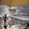 Dried flowers like offerings lie atop a gauze-covered rectangular frame. Pebbles surround its base alongside plaster casts, a desiccated dragonfly and an animal foot charm. Their placement is purposeful; their exact significance unclear. Four rib-high figures with moon faces, sausage string necks and wafer-thin bodies face the frame. Three wear golden gowns like devotees or disciples; all bear pendulous, darkly bellying stomachs before them over their clothes.