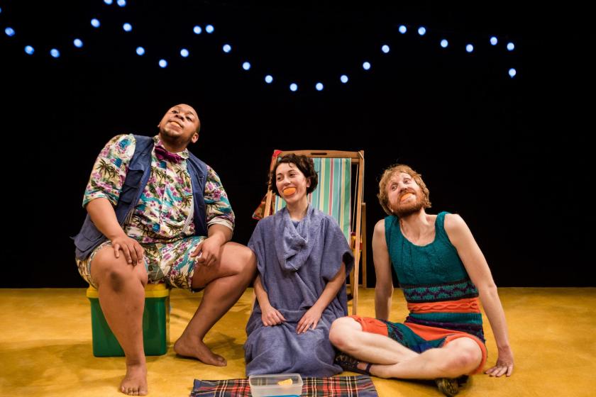 Jeramee, Hartleby and Oooglemore was created by the Unicorn Theatre, a venerable London institution which has focused on creating theatre that appeals to children since the mid-1940s. Directed by Tim Crouch and written by Gary Owen, it stars Jude Owusu, Lotte Tickner and Fionn Gill, respectively, as the titular characters. With much brio, they inhabit the roles of three children (we must assume) on a beach. The only dialogue throughout, including an amusing transistor radio broadcast Jeramee listens to as he relaxes in his deckchair, is their names, yet the trio build an ebullient character comedy that’s more engaging than seems feasible, given the simple ingredients.