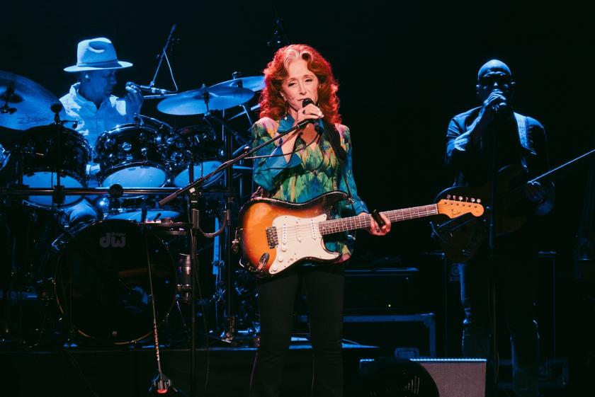 Raitt plays for an hour-and-a-half and has real presence, a gregarious chatty ease that’s both funny and affectionate, the gift of being genuinely “there” in front of 1700 people. She’s petite and lithe, her signature hair bright red with a white streak, wearing a metallic aquamarine blouse and black rock’n’roll pantaloons. Her backdrop is simple yet surprisingly effective, a tree-lined lake beneath a hazy sun, its mood changing, dependent on the lighting. She opens with the down-home boogie of “Split Decision” from 2012. And we’re off.
