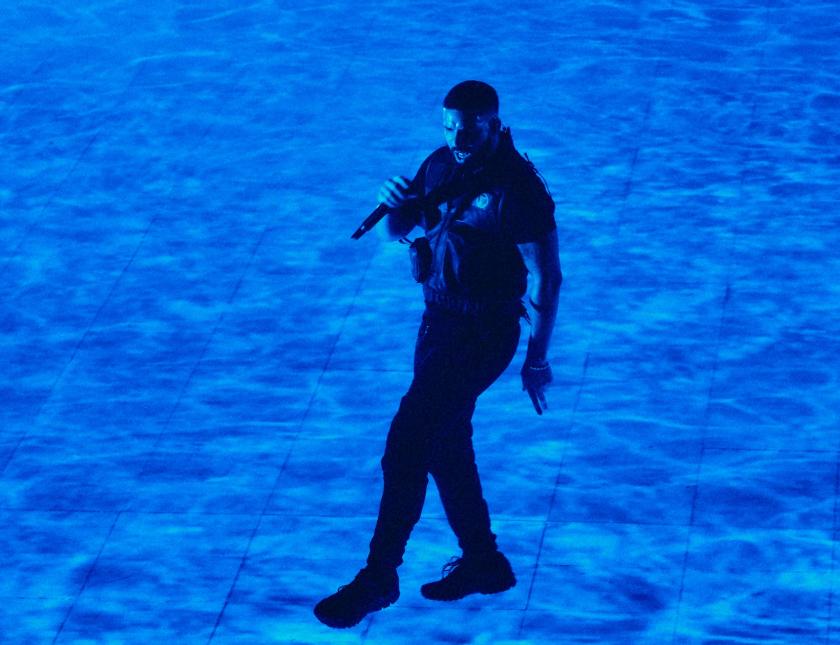 There was serious money on show. That constantly shifting video floor was something else: at one moment, Drake could be strolling above a pool with women swimming below him, the next he could be floating in space. There were fireworks, dancers, smoke plumes, lasers, a model of a Ferrari floating above the crowd, a basketball court picked out with lasers. Then he topped the lot by bringing on fellow rap royalty, Future.