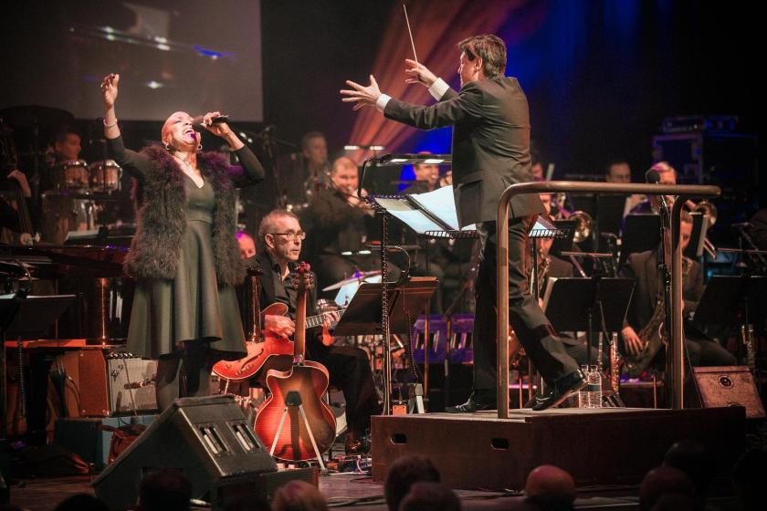 Is it just me, or do Guy Barker's orchestral charts for Jazz Voice get more refined, more nuanced, more richly detailed every year? Effectively becoming earworm central last night, the Barbican resounded with tintinnabulating glockenspiels, delicately plucked harp strings, punchy horn charts and luxuriant strings, as Barker sprinkled his arranging magic over the customary epoch-spanning celebration of anniversaries, birthdays and milestones stretching back from 2014.