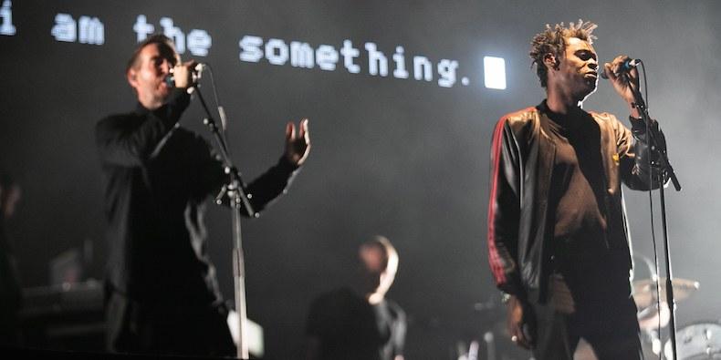 Massive Attack’s set, accompanied by film material directed by Adam Curtis in collaboration with Robert del Naja, poses some alarming questions about the way technological progress has changed the world we live in, and threatens to change it even more. The first of many contradictions arises out of the high-tech nature of the show: multi-screen projections, elaborate and often stunning lighting effects, words and phrases flashing behind and alongside the band momentarily touch our consciousness – who knows, perhaps below the level of consciousness as the best and worst of advertising, but reaching us all the same.