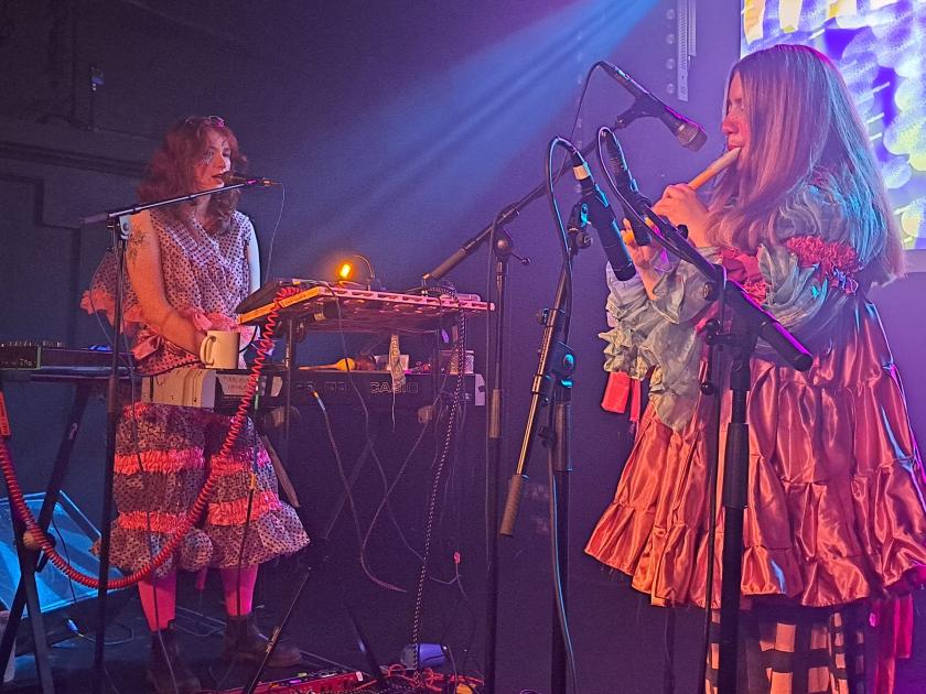 From there, they presented the room with a “traditional Italian melody singalong” with Moina Moin laying down bursts of stream of consciousness lyrics, such as “Maybe I’ll be wearing my trousers… baby, baby, baby, baby… flip-flop, flip-flop” before taking in a chorus from “Little April Shower” from Disney’s 1942 film Bambi – all over a strange motorik-folk mash up that got plenty of hips swinging in the audience. Then there was a short interlude “to do with knees” that saw Tate and Moin perform a short, synchronised dance behind their instruments before another burst of impromptu, pipes and loops and a claim that “It’s a bit ambient in here. Nothing’s really in focus”.