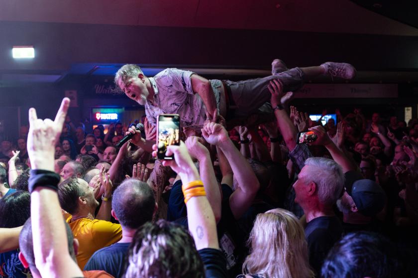 850-capacity Chalk, is bouncing. The crowd are mostly in their forties and fifties, but not fossilised-to-the-floor BBC 6Music dads; there’s plenty of movement, plenty of grinning women, shaking what God gave them. The evening didn’t start this way. A half-full venue and lacklustre vibe greeted the band as they opened with the manic, breakbeat of “Dance of the Mad Bastards”. Pop Will Eat Itself take off with antic dynamism and don’t let up for an hour-and-20. They take the crowd with them all the way.