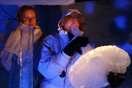 On stage, Isungset stood behind two ice plinths, one solid, the other hollowed out like a basin. The solid one was struck like an anvil, the hollow one had bars laid across it, becoming an ice marimba. Bars of ice hanging from an ice scaffold were struck like chimes. As each song ended, and as the melt water began dripping, a man in a red jacket with “Ice Crew” written on the back ferried the instruments from the stage and brought new ones forth. Although there was little certainty with these instruments, they were still recognisable as traditional percussion. Ice gamelan.