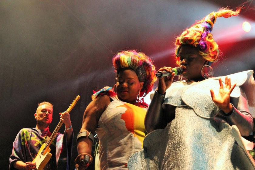 When we wandered onsite, Public Service Broadcasting were playing. The daytime did not suit their space travel-themed multimedia show, which is far better in a more confined, darkened venue. Happily, no crowd can resist “Go!”, their catchiest tune, and toddlers on shoulders were punching the air by its final chorus. The highlight of the night, however, and indeed the whole festival, were headliners Basement Jaxx (crowd reaction, pictured above right). The London producer-DJ duo presented a carnival of Afro-Latin-tinted dance music from across their seven albums, a stream of guest performers lathering the whole thing in showbiz colour and charisma, from the main two singers (main picture), one of whom supported herself on a crutch throughout, to a male MC, a lithe female dancer, and others besides. At the start of their set the sound was sludgy but slowly grew better and they attacked tunes such as “Romeo” and “Bingo Bango”, eventually going ballistic with the Gary Numan-sampling noisiness of “Where’s Your Head At?” The stage was then invaded by a gorilla-costumed armada. Basement Jaxx don’t ram their dance music home with pile-driving electronic force. They are friendlier, more organic, with full band and percussion. Theirs was a party for all and the family crowd lapped it up.