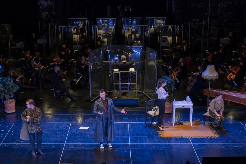 The orchestra is on a darkened stage, behind the proscenium arch, ghostly masked figures barely visible behind a multitude of flexible perspex screens. The stage is extended over the orchestra pit and lightly furnished with a table, two chairs and a standard lamp that look as though they may have been borrowed from the Bearsden Amateur Dramatic Society. Around the edge, some potted plants, among them what look like tangerine trees bearing fruit, though at an enforced distance through a computer screen it is difficult to tell if they are real.