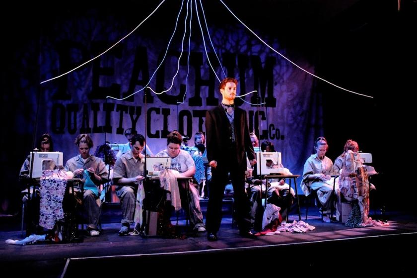Dorrell runs with it. Ambient industrial noises fill the auditorium pre-show, and the Beggar (Tom McCann) shuffles on through the audience in baseball cap and hoodie, dragging his sleeping bag behind him. Peachum is a small-time entrepreneur and the action takes place entirely amidst the hunched wage slaves of his backstreet sweatshop. There, we meet him (Matt Hayden), together with his wife – played as prime Northern battleaxe by Lydia Jane Haynes – their daughter Polly (the sweet-toned and wide-eyed Lizzie Lister, pictured right with Holly Singlehurst as Lucy), and in time, Gay’s whole Hogarthian carnival of Georgian low-life. Dorrell apparently wanted to “grunge up” the singing; this initially seemed to take the form of Haynes snarling the ends of phrases and Lister swooping up from under the note in TV talent-show style.