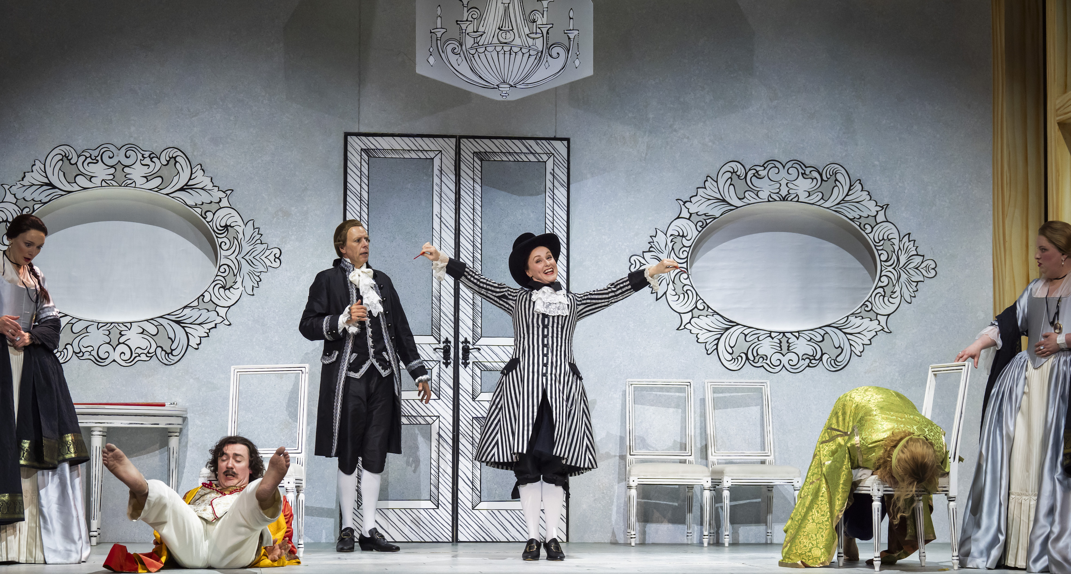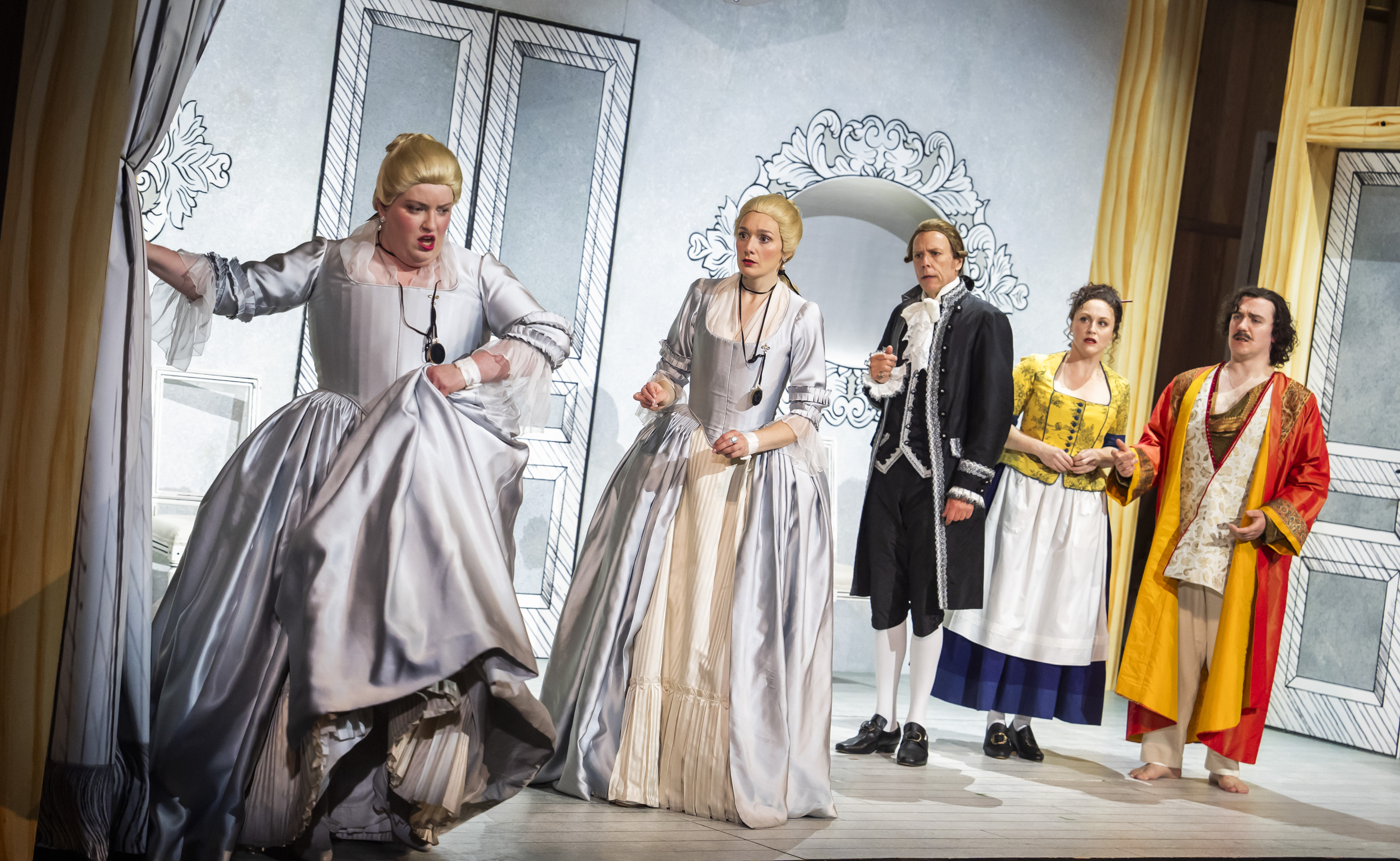 Despina, the below-stairs schemer who out-foxes even Alfonso, can run away with Così, and Claire Lees on occasions threatened to do that – especially in her commedia dell’arte turns as fake doctor and lawyer (pictured below centre). However, tight ensemble work meant that her sassy showpieces – above all, “Una donna a quindici anni” – knitted snugly into the action that her intrigues do so much to advance. The principal quartet skipped through the farcical elements with a swift and easy touch, with wistful melancholia never more than a heartbeat away. As for the villainous, cold-eyed behaviourist who oversees his cunning plan, Alfonso can be a thankless part – but William Dazeley’s strong-voiced baritone sustained the creepy authority of this string-pulling puppet-master from initial project to final twist.