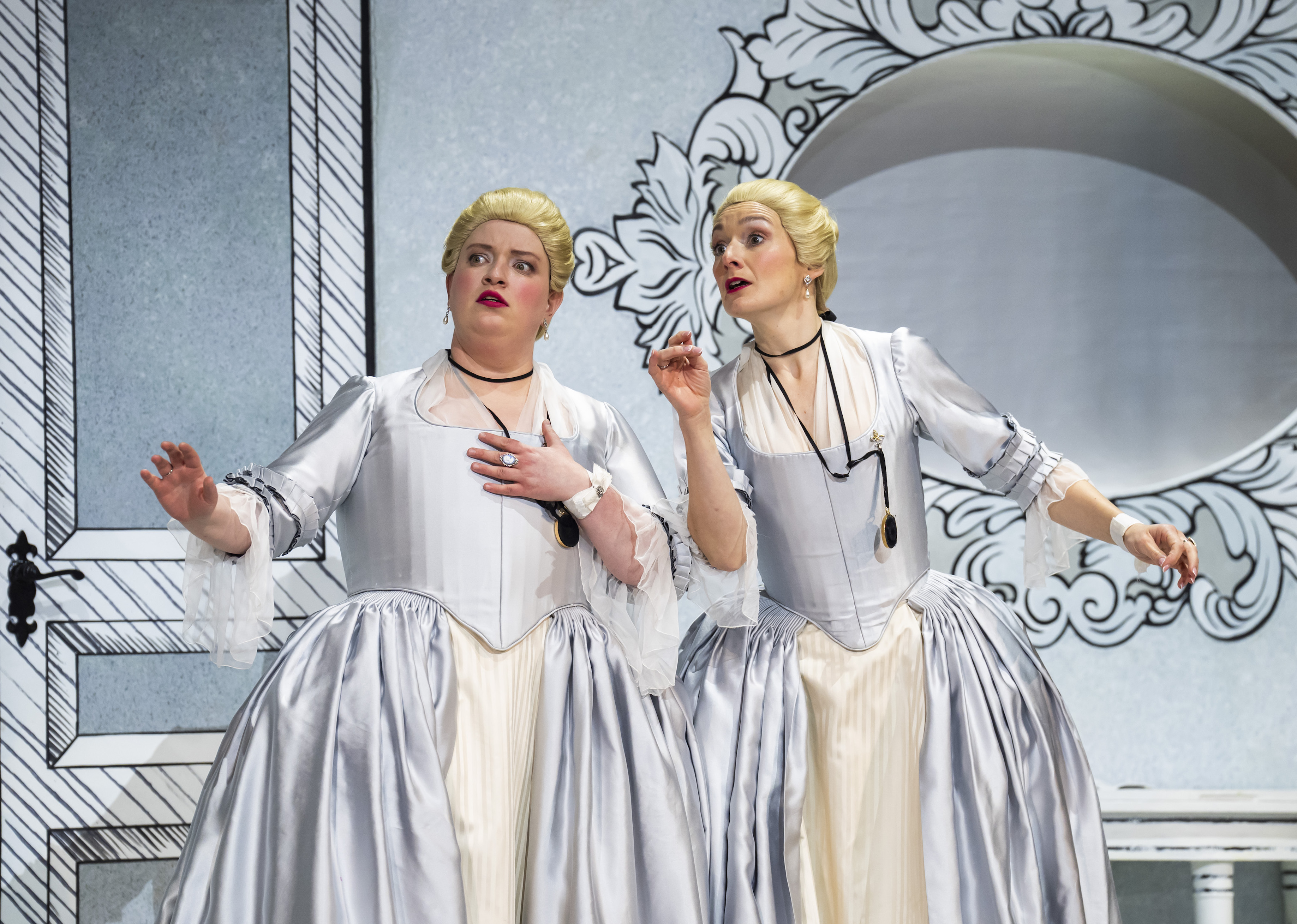 Perhaps Stinton pushes her play-within-a-play motif too hard at times. Scores can be over-fussily consulted at key junctures, although some moments – notably, when Fiordiligi (Ella Taylor, pictured below left, with Heather Lowe) rips up her assigned part at the close of “Come scoglio” – work a treat. And, as each one of the male duo tries to woo the other’s sweetheart when dressed up as romantic foreigners, we see how the manipulators may be manipulated – and how actors may get emotionally entangled in their parts. Stinton, and costume designer Stephen Rodwell, downplay the exoticism of Ferrando and Guglielmo in disguise: no “Albanian” fancy-dress headgear here; just scarlet and green robes that, as the lovers switch affections, match the women’s gowns. Music, rather than millinery, will turn these lovers’ heads, and hearts.
