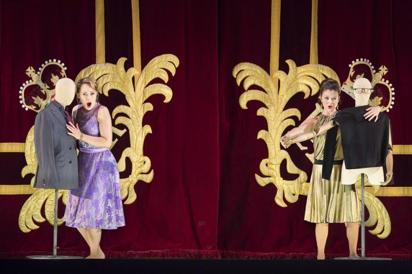 Never really witty, Gloger's main contributions to the actual dynamics of the foursome who change partners and change back again - or do they? - are to make each Act Two duet in which the men in disguise test each other's fiancees for real. The girls seem to take on each other's men in their duet with two dummies (pictured up top). Dorabella realises it's Fiordiligi's man wooing her when she takes off his “Albanian” headgear, and in both cases discarded moustaches are the final seal of recognition.