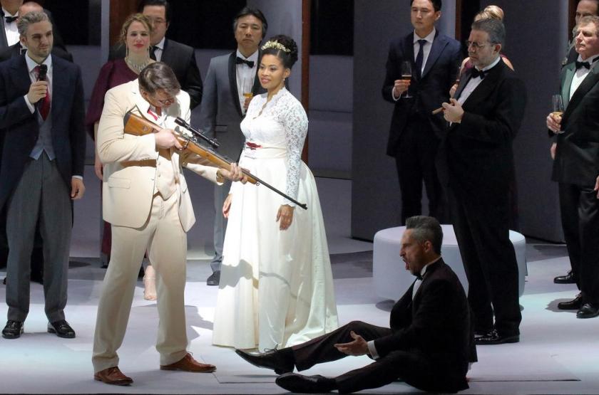 Much of the spoken dialogue is retained – it’s usually the first thing to go in a Regie reimagining – but Tcherniakov finds creative ways to both interpret and present it. In the first act, Max’s spoken confessions to the audience are instead projected as text above the stage, allowing the narrative and music to flow without interruption. In the second act, the dialogue between Agathe and Ännchen is both sung and texted, the two characters typing away on their phones and the texts again appearing above the stage. But Tcherniakov goes further, and the texts diverge significantly from the libretto. The idea here is to reimagine Ännchen as a divisive influence, rather than just the meek companion for Agathe. This dynamic is intended to highlight power struggles within the family, and that also seems to be the reason for the corporate setting. It’s more about hierarchy than commerce, and the production never aims at a critique of capitalism. But the Agathe/Ännchen dynamic doesn’t really work. Weber and his librettist weren’t feminists, and were happy to present social dynamics of their hunting community without criticism, so Tcherniakov has little to work with, in the end trying to resolve the tension he has created through more above-stage texts in the final act, even as the action moves in unrelated directions.