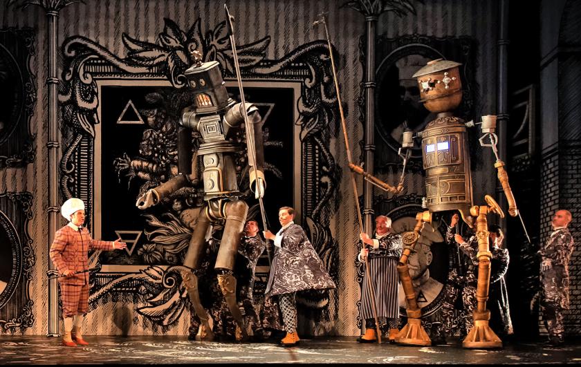 Further visual enrichment comes from Patrick Martel’s puppets, expertly handled by a half-dozen puppeteers. This shadow-cast of figures ranges from miniature homunculi in the garbs of Tamino or Papageno through a super-sized dancing pig in the kitchen, the dragon-serpent that pursues Tamino at the outset, and (the absolute pièce de résistance) the two enormous armoured giants that we meet, striding and clanking across the stage, in the second act. Moments like this deliver genuine coups de théâtre: they’re terrific fun as well.