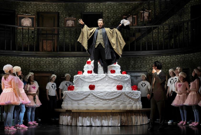 The ascent from tragedy to comedy is completed as the action arrives at Don Giovanni’s disruption of the wedding party between Victoria Randem’s confident, flirtatious Zerlina and Michael Mofidian’s wonderfully down-to-earth Masetto (both pictured below). Here Clément has opted for the full carnivalesque treatment, giving the set up a full hen-party makeover as Zerlina and all her friends appear in pink tutus and fake plastic boobs and the men appear in jaunty stags’ horns, offset by their turquoise jackets.