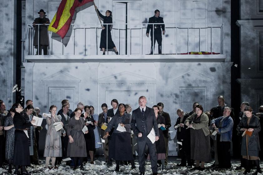 Bieito explains that the civil war setting offers a parallel to the central family drama of the opera: the Vargas family torn apart through their incapability for reconciliation. As in civil war, the enemy is within. Visually, the setting takes on a greying monochrome, partly referencing newsreel footage, but also Picasso’s Guernica, and at one point the image of a startled horse is projected against the backdrop to make that connection explicit. One area that doesn’t lend itself to subtlety is the evocation of fascism, and the first two acts are weighed down with oppressive back projections of goose-stepping soldiers and giant jackboots. There is also a book-burning, or at least tearing-up, scene in the second act that seems heavy-handed. But the civil war angle works, especially for the specific context it provides for the ill-defined wartime setting of the libretto.