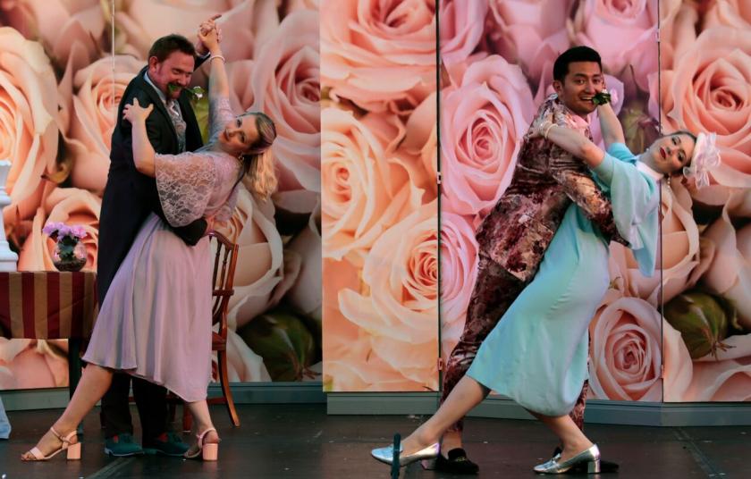 Their energetic efforts do eventually pay off. Jeremy Gray's designs - knitwear, not sure why, for the home of Baron de Montefiascone, floral wallpaper for the ball at which Cinderella can disguise her identity by holding a single rose - work as well as they can in a very small space, blocking out most of the orchestra (conductor Harry Sever is seen on two large screens). Gray's direction is more village-hall antics, with too much mugging from the singers and a couple of gimmicks designed to fill out the longer numbers with business that doesn't always read.