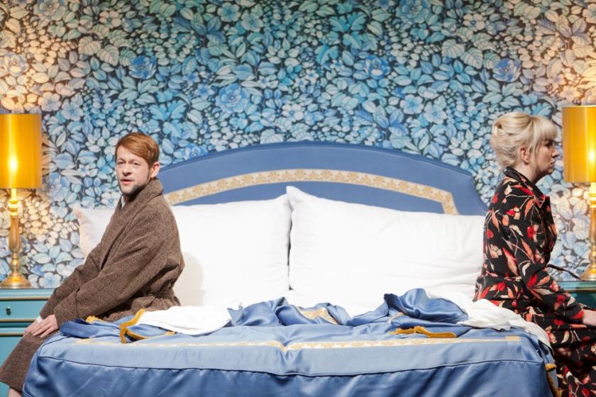 The idea is a kind of dreamsong sequence the Germans might call a Traumliederabend. The realistically tasteless room happens to have three sets of occupants simultaneously. The future pianist is getting up at the start and sings a promising old canon about the "golden sun" with a haunting offstage voice (Augestad’s). The two singers listed as “King’s Daughter” and “King’s Son” (Michael von der Heide) come on as servants making up the bed and then get into it, uneasy non-sleepers and non-touchers. The older woman – a deadpan, battered-looking Nikola Weisse – crosses the stage repeatedly, recites broken poetry very quietly, fiddles with a music stand, clambers up a cupboard (pictured above, with von der Heide and Augestad) and eats spaghetti out of her handbag to a trio from the pink bathroom giving us the reconciliation music of Mozart’s Marriage of Figaro (I did laugh at that odd juxtaposition).