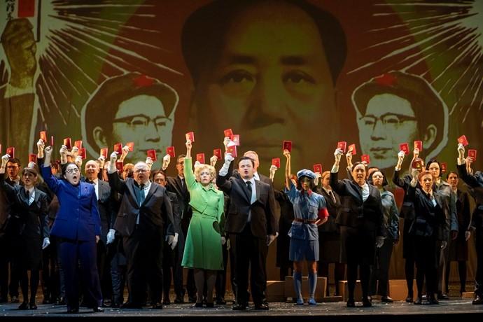 The principals were good: strong-voiced (we’ll get to that later, too) and persuasive in their individual roles. In the title role Eric Greene’s baritone speaks (more than Nixon might have done) of empathy and suffering, while his wife Pat, sung by Julia Sporsén, is lighter and, true to character, slightly hysterical. David Stout brought a stout and resolute bass to the wily Kissinger, while Nicholas Lester was lyrical and reflective as Chairman Mao’s prime minister. Mao himself, sung by Mark Le Brocq (pictured above with Greene's Nixon), coughing and spluttering into a handkerchief, in an eerie pre-echo of the public health emergency now gripping the world, was eclipsed by the supercharged appearance of Hye-Youn Lee as Madame Mao, delivering the Party message in a succession of dizzyingly high notes.