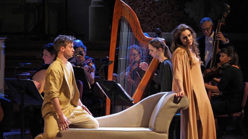 The overall line-up is variable. Three supporting sopranos it would be kinder not to name don't really cut the operatic mustard. True bass Gianluca Buratto is very loud as Cadmus, the father of Semele and Ino, much more effective as Somnus, awakening from the depths of the two bassoons who play at his head at the start of the third act. Counter-tenor Carlo Vistoli makes a lovely sound as the dramatically more or less otiose Athamas; it's good that he gets his final celebratory aria, not on Gardiner's recording, but it's a maddening dramatic hold-up between the superb choral response to Semele's death and the final celebration of Bacchus rising from her ashes. Outdoing him for doughtiness is contralto Lucile Richardot as Ino, the sister he prefers (pictured above with Vistoli); those redoubtable chest tones are better brought into play when she takes on jealous Juno, though there could be more on-the-note singing and a more perceptive director than Guthrie would have got her to rein in the flouncing expression of her ire.