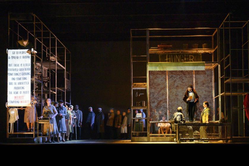 As the “country policeman” Olim, who first persecutes the poor but then discovers his solidarity with them, Ronald Samm’s baritone has a sympathetic gravitas that anchors the strange voyage we will take with him. As for the orchestra, I missed at first the finely sharpened punch and rasp that Weill’s upbeat numbers demand. However, the granitic chorales – with shades not only of Mozart’s Flute but Bach and Brahms – had a moody grandeur greatly enhanced by the singers from Streetwise Opera (which works with people affected by homelessness).