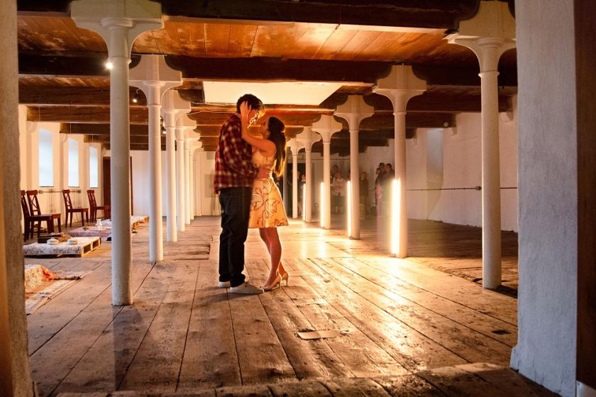 Likewise the pithy phrases of Puccini’s Gianni Schicchi. The schedule meant missing the first quarter of an hour down in the perfect immersive space of the Grain Store at Stonebridge Harbour while Fille burbled along to its happy end; I was guided to the standing crowd in the first of four rooms just as young relative Rinuccio (Conor Prendiville) stood on a chair brandishing the will of uncle Buoso Donati, only for Aunt Zita to peruse it and find the “fecker” – as one of the 11 extra second cousins et al called him in occasional extra spoken lines – had left everything to the friars.