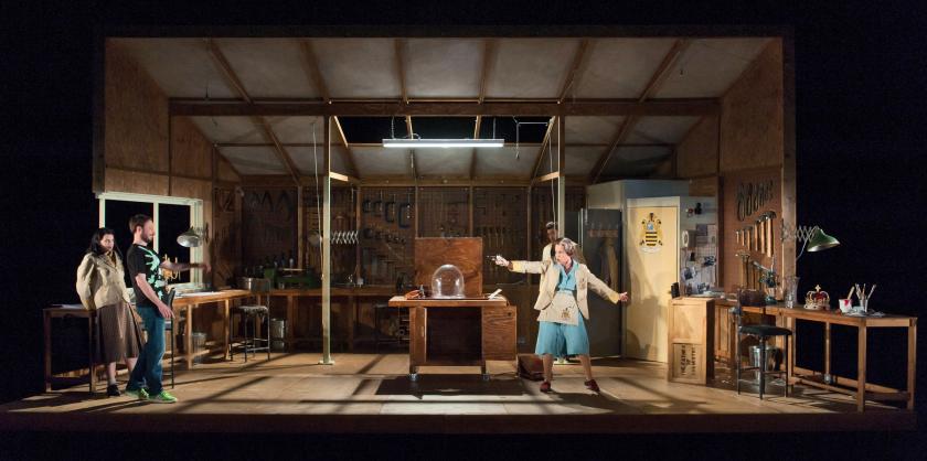 The cast are superb and outwardly unfazed by the sheer amount going on, gamely throwing themselves at the mountains of text, all the while managing the various bits of visual silliness that director Bijan Sheibani tries to squeeze into the gaps between large chunks of information being exchanged. Rogers’ vocal writing rarely unbends into melody, but both the wonderfully watchable Curievici and soprano Robyn Parton (Peg) manage to discover some beautiful lines in it, even when sitting in the outer reaches of their register. These two also carry the lion’s share of the drama, playing nicely off one another as tragedy and farce begin to collide.