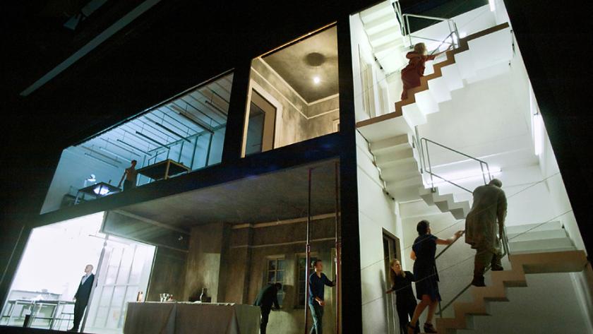 Vicki Mortimer's sets complicate things in a good way. One half of the modernist doll’s house we look into - the half housing the couple – is quasi-medieval, the other – where intervening angels and their helpers work - 21st-century. Interesting questions arise from this juxtaposition, as it appears that fantasy is housed in the modern world and reality in the medieval.
