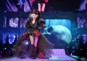 The backscreens pop alive. A wall of photographer’s flashguns. On cyberpunk crutches, Lady Gaga stumbles jerkily towards us. She sings her 2009 global smash “Paparazzi”, her arms clad in armour, on her head a metallic skullcap. Her corseted dress has a train that extends, diaphanous, floating back behind her the entire length of the long catwalk into the audience. It disappears into the darkness of an arch.