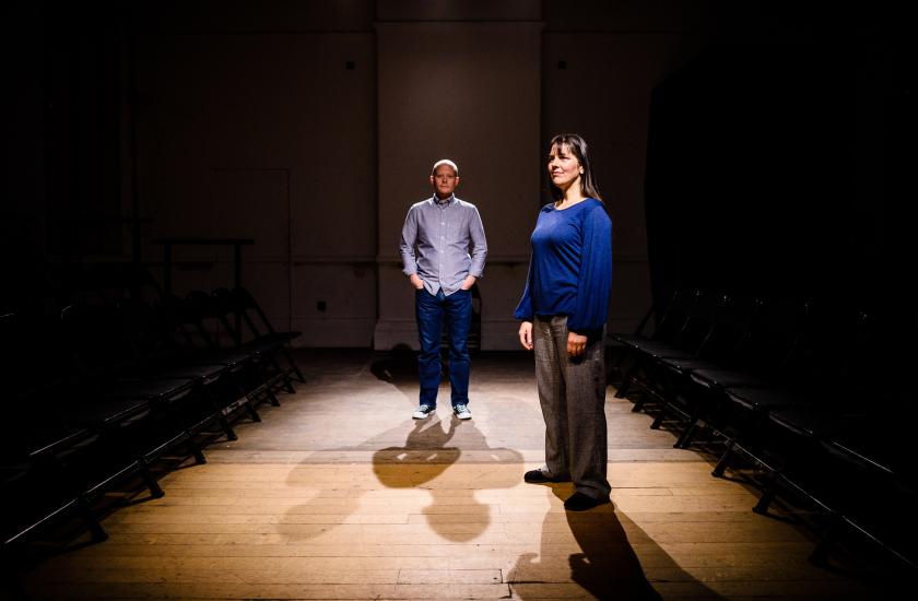 A House Repeated is one of those things that makes perfect sense when you’re there. It’s super-easy to understand, but whenever I do any press or write publicity copy it’s difficult to communicate quickly. Without trying to be pithy, here’s how it works. Zoe and I are standing on a bare stage between two banks of audience, so the audience is seated traverse, one half of the audience is facing the other half, and we’re in the middle. After the intro and all that, I turn to my half and I describe a place: “Imagine you’re standing outside. In front of you is a building.” That kind of thing. Then I give some options about where they might go and ask them what they’d like to do: “You can go through the door; you can go upstairs?” Go upstairs. Turn to another another member of the audience: “In that room you’ll find this.” Maybe there’s a bottle on the table, what do they want to do? They can interact. Zoe’s audience are also giving her instructions as to how to explore this imaginary environment. Now, as they navigate their way through, maybe a narrative or an implied narrative starts to unfold. Two different audiences are each controlling a different explorer, an avatar, and might see what the relationship is between them. That kind of thing. It’s hard to get that down in less than 50 words for a brochure.