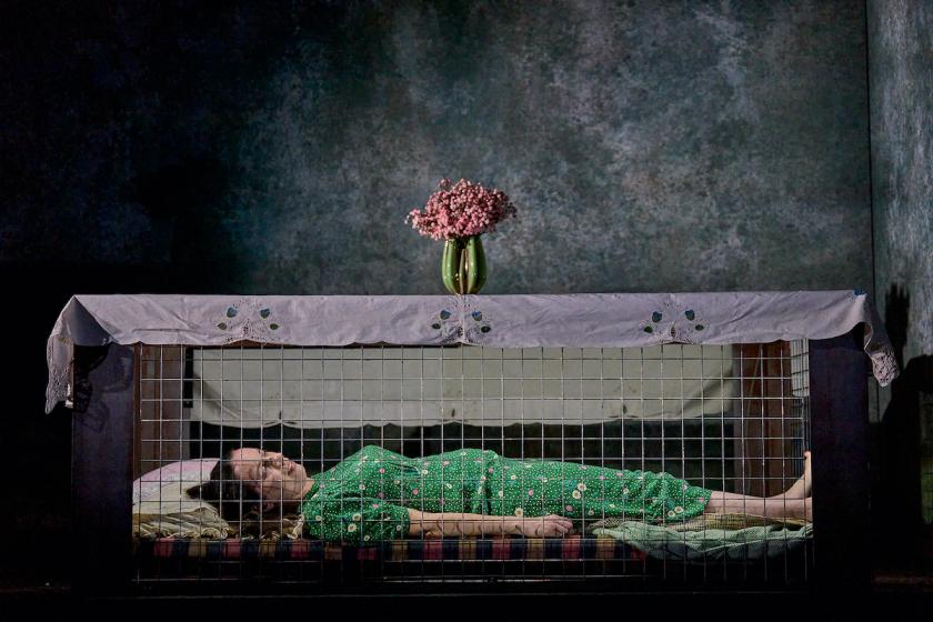 The most mentally explosive experience, in the main Downstairs space, is McDowall’s trilogy of short plays, which are all performed by Kate O’Flynn in what must surely be a career-defining event. The first 20 minutes is Northleigh, 1940, in which a young woman joins her father in their Morrison shelter, a wire-mesh tomb-like container on the floor of the dining room, during a wartime air raid. Starting with the elevated and inflated tone of lyrical poetry – “Alone, on ashen sands that yearned beyond/ All measure known in realms familiar” – the piece then grounds itself in northern everyday chat, before evoking, more abstractly, the falling German bombs. It’s intriguing and allusive, but less impressive than the next two monologues.
